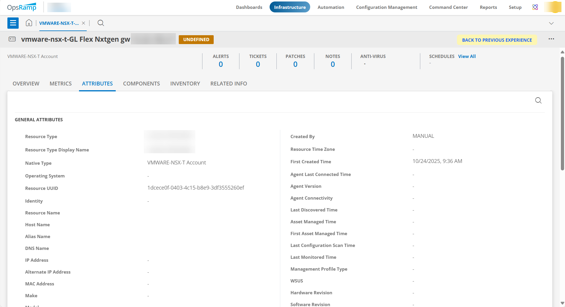 - Click the ATTRIBUTES tab to view the attributes details for VMware NSX-T.