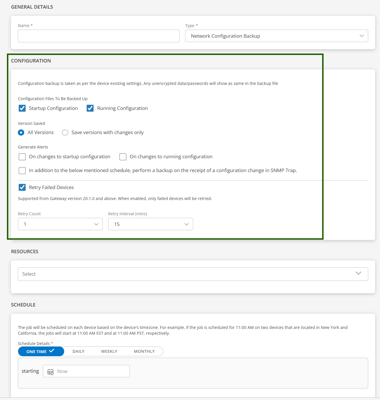 The configuration is the same for all job types, except that Network Configuration Backup jobs include a few additional fields, which are described below.Network Configuration Backup Job